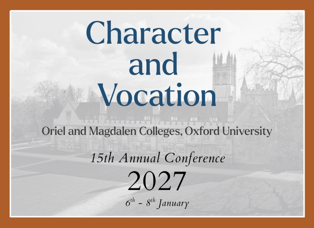 The Centre is now accepting proposals for its 15th annual conference, ‘Character and Vocation’. The multidisciplinary conference will take place between the 6th – 8th January 2027 at Oriel and Magdalen Colleges, University of Oxford. The broad aim of the conference is to discuss the concept of ‘vocation’, investigate the link to moral or professional identity, and explore questions around the connection of vocation to various areas including leadership, moral exemplars, meaningful work, changes in the digital age, and more. This year we particularly encourage submissions of symposium proposals, and we ask interested parties to submit a 500-word abstract here. The Centre welcome proposals from academics, teachers, professionals, and other practitioners. You can read more about the conference here.